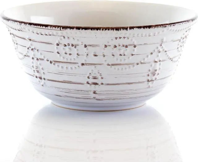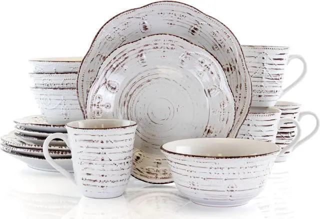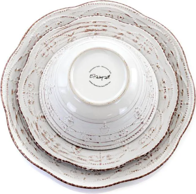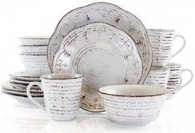 Enjoy the Elama Rustic Birch 16 Piece Stoneware Round Dinnerware Set at any home dinner table setting. The white dishes feature an organic and rustic birch wood like design along the exterior. This woodsy look is accompanied with an enchanting embossed pattern. Stoneware construction of each dish is ideal for special occasions and durable for every day use. Each piece is microwave safe for quick reheating and dishwasher safe for easy cleaning.