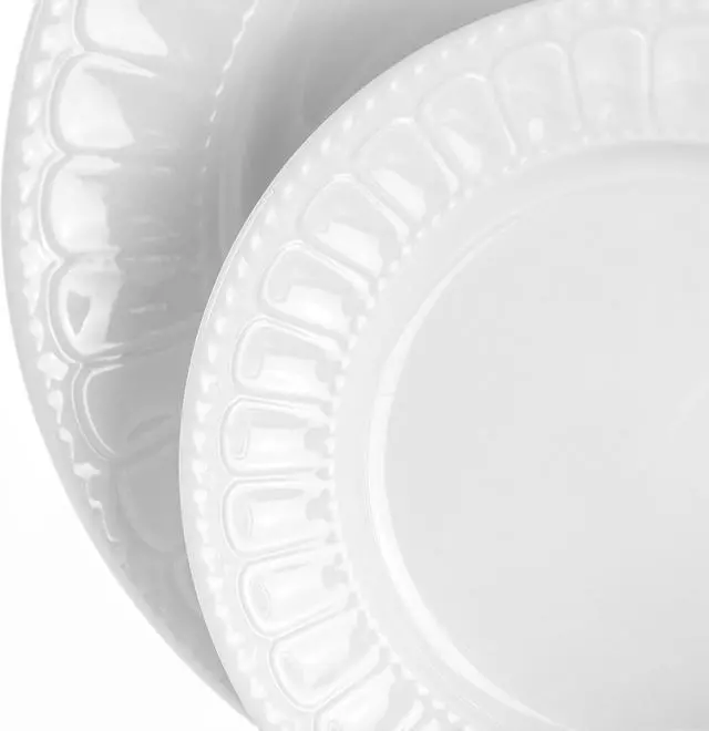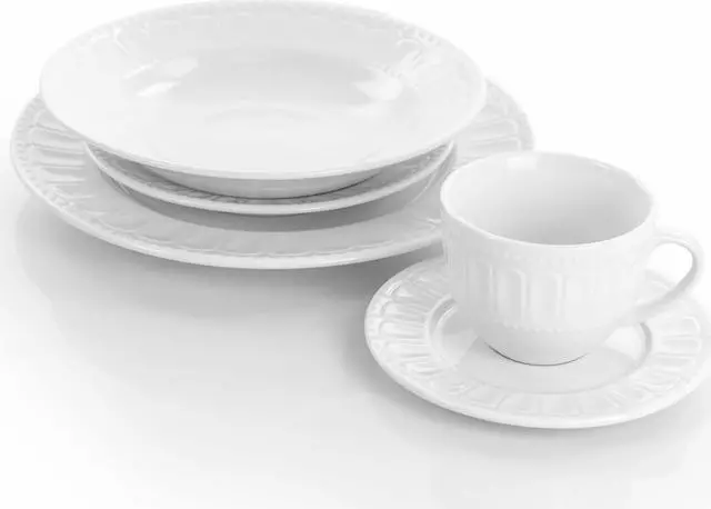 Impress your guests with the Elama Charlotte 20 Piece Porcelain Dinnerware Set in White. This dinnerware set has an elegant arch and dot embossed design on each piece for a uniform and classic look. This set comes with four ten ounce mugs, four saucers, four salad plates, four eight ounce bowls, and four dinner plates to complete four whole place settings. Made with quality porcelain this set is completely microwave and dishwasher safe and will soon become your go-to.