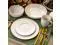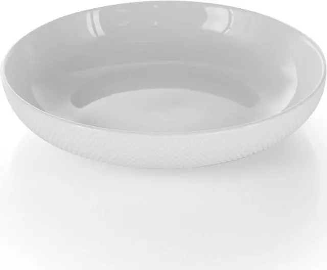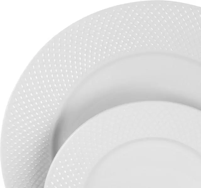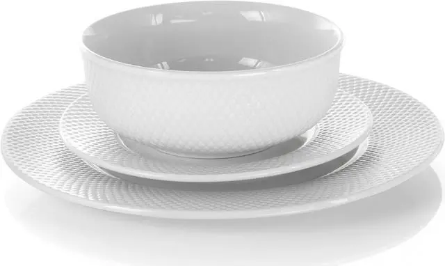 Enhance the table space with the Elama Maisy 18 Piece Round Dinnerware Set in White. Featuring a stunning embossed diamond pattern along the exterior of each dinner plate and bowl. The dinnerware set only proves to upscale simplicity. Made from a durable Porcelain construction, the material helps meals retain heat longer. Guests can enjoy your best cuisines at their own pace without fear. For complete convenience the set is dishwasher safe for easy cleaning and microwave safe for fast reheating. Relish in the moment as snacks, entrees, soups, desserts and more are served.