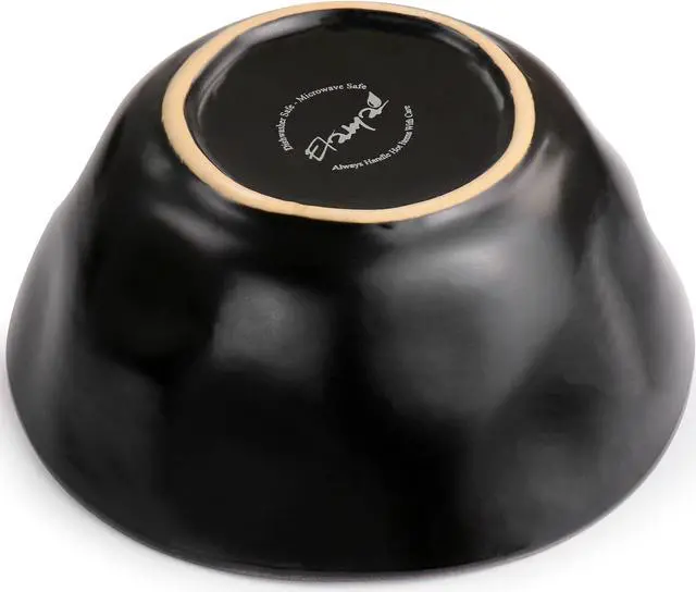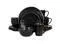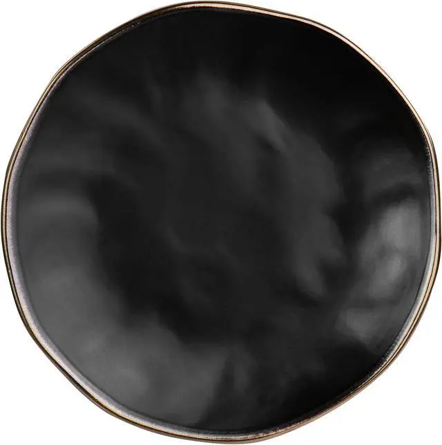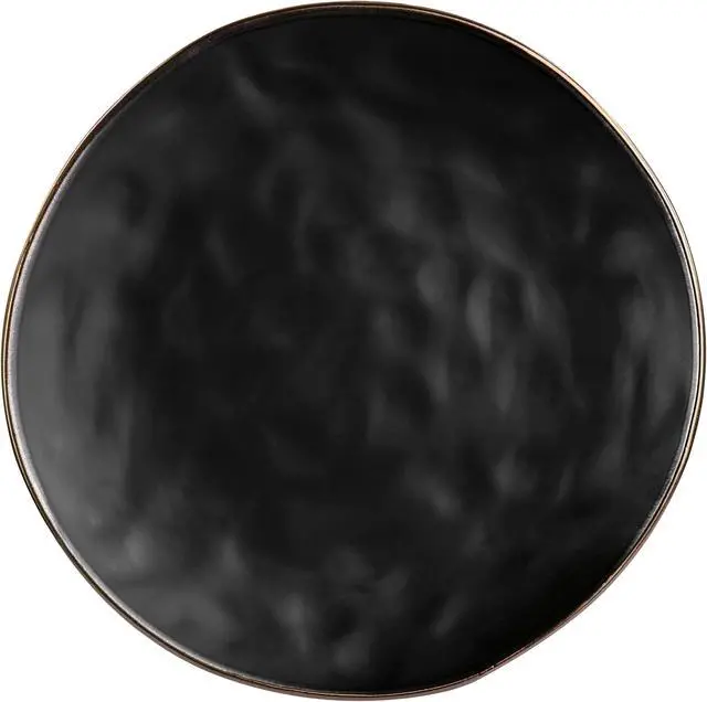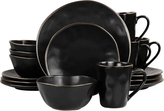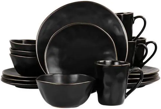 Add a beautiful accent to your dining table with the Elama George 16 Piece Round Stoneware Dinnerware Set in sophisticated Matte Black with Gold Rim Trim. Each dish is creatively crafted with a unique textured, uneven dimple design and beautifully Finished off with an elegant gold rim. Constructed of Stoneware, this set is ideal for special occasion gatherings and sturdy for every day use. Each dish is microwave safe for quick reheating and dishwasher safe for easy cleaning.