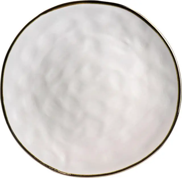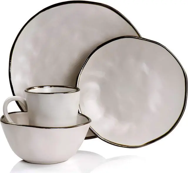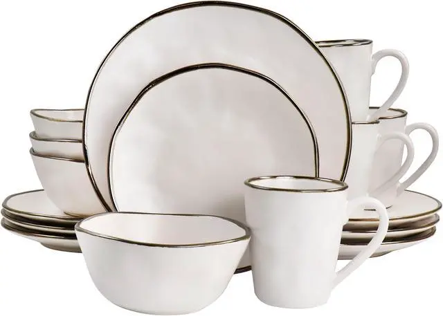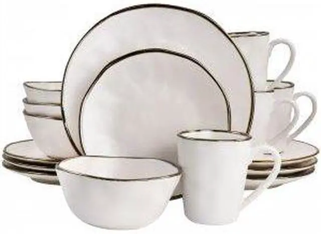 Add a beautiful accent to your dining table with the Elama Christian 16 Piece Round Stoneware Dinnerware Set in sophisticated Matte White with Gold Rim Trim. Each dish is creatively crafted with a unique textured, uneven dimpled design and beautifully Finished off with an elegant gold rim. Constructed of Stoneware, this set is ideal for special occasion gatherings and sturdy for every day use. Each dish is microwave safe for quick reheating and dishwasher safe for easy cleaning.