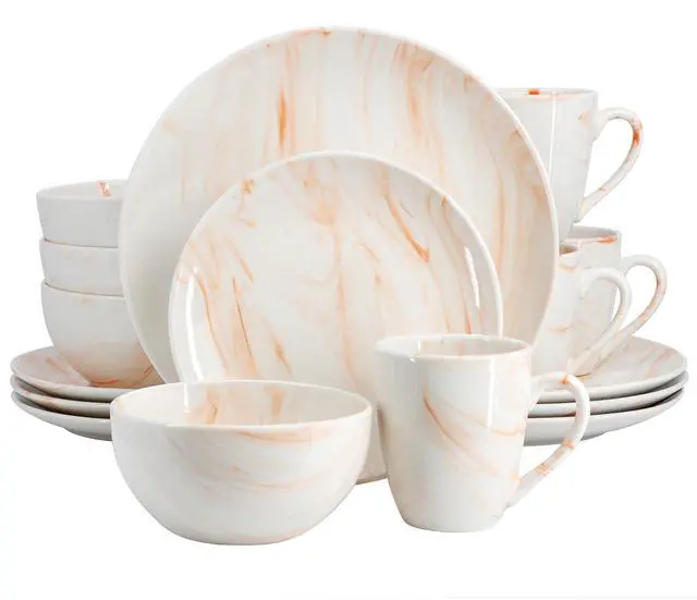 Bring the sophisticated look of marble into your home with the Elama Fine Marble 16 Piece Porcelain Dinnerware Set in Orange. Every plate in this collection is decorated in a fine marble pattern and coated in a glaze finish for a sleek and shiny look. This dish set is crafted from quality Porcelain, making it both microwave and dishwasher safe for easy cleaning and everyday use. Tableware set comes with a full service for four, making this the perfect addition to your dining room table for family gatherings or dinner parties.