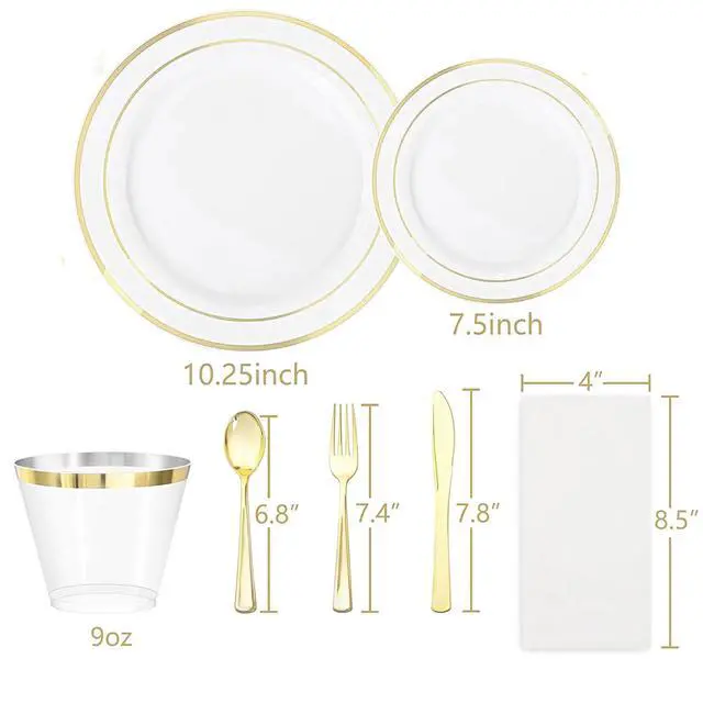 Elevate your next event with the Elama 350-Piece Disposable Plastic Dinnerware Party Set, designed to serve up to 50 guests. This elegant set features a clean White plate accented with a rich gold r trim, offering a perfect balance of style and functionality for weddings, parties, or any special occasion. Made from high-quality food-grade plastic, each piece is BPA-free, ensuring a safe dining experience for all guests. The spill-free design and secure base ensure durability and stability, even in more lively settings, while the disposable nature makes cleaning up quick and hassle-free.