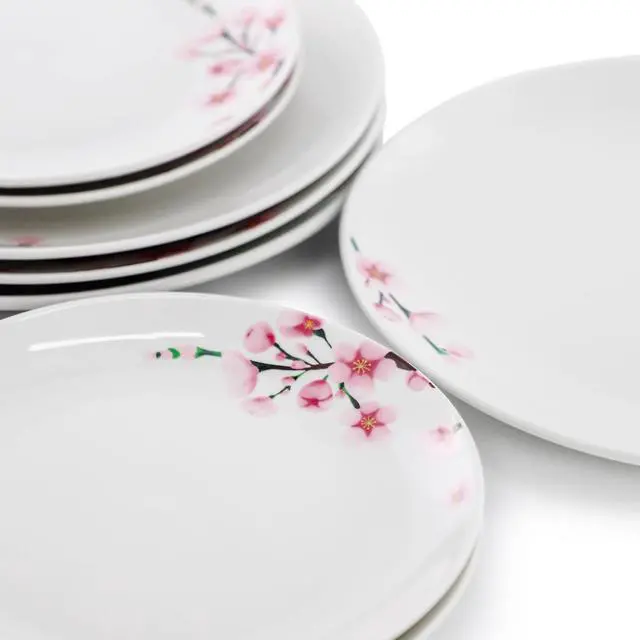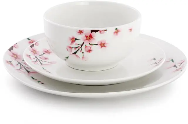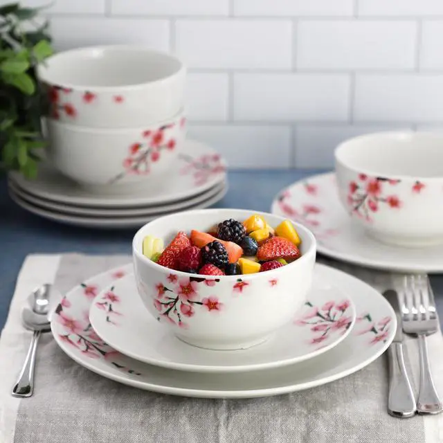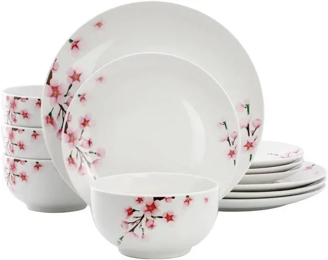 Bring a touch of elegant charm to your table with the Elama Tamara 12 Piece Cherry Blossom Porcelain Dinnerware Set. Crafted from durable porcelain with a smooth glazed finish, this round dinnerware set features a delicate floral cherry blossom design in soft pink against a crisp white background. Designed to serve four, the set includes 12 pieces that are perfect for everyday meals or special gatherings, blending beauty and practicality with ease.
