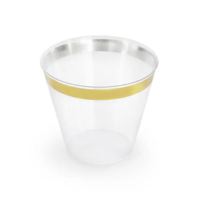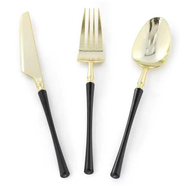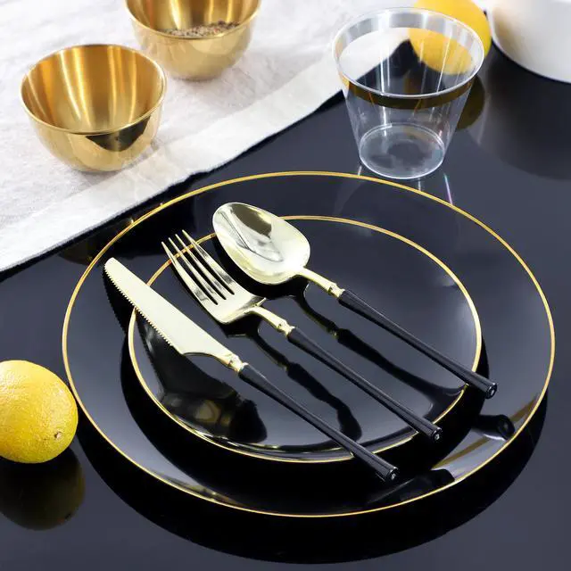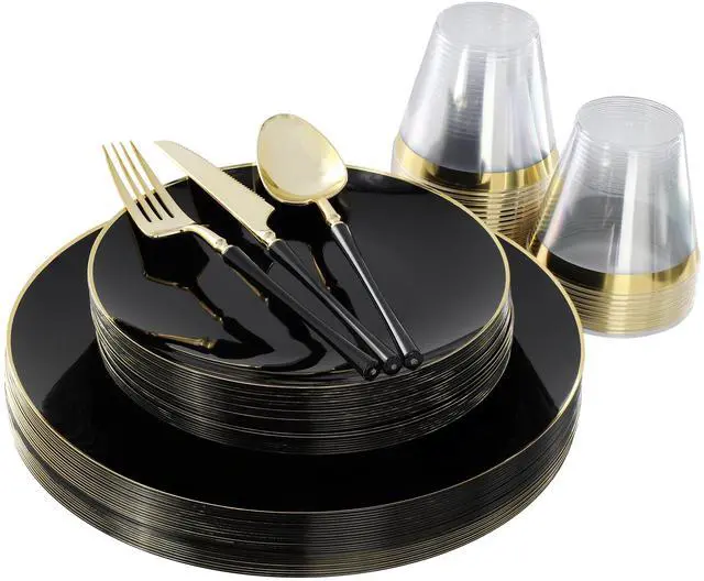 Elevate your next event with the Elama 150-Piece Disposable Plastic Dinnerware Party Set, designed to serve up to 25 guests. This elegant set features a clean black color accented with a sophisticated gold trim, offering a perfect balance of style and functionality for weddings, parties, or any special occasion. Made from high-quality food-grade plastic, each piece is BPA-free, ensuring a safe dining experience for all guests. The spill-free design and secure base ensure durability and stability, even in more lively settings, while the disposable nature makes cleaning up quick and hassle-free.