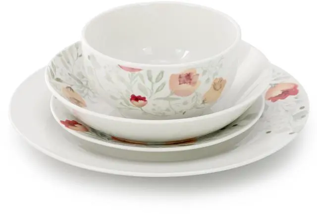 This 24 piece dinnerware set includes six 10.5 inch dinner plates, six 8 inch salad plates, six 8.8 inch soup bowls (24 oz), and six 5.5 inch cereal bowls (22 oz). Crafted from durable porcelain, the Elama Poppy set delivers timeless style and versatility. Perfect for family meals, entertaining guests, or gifting to loved ones.