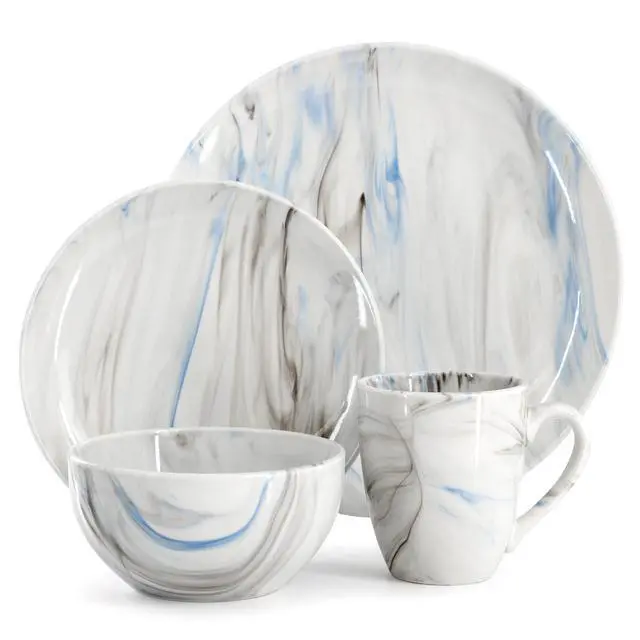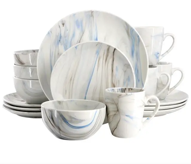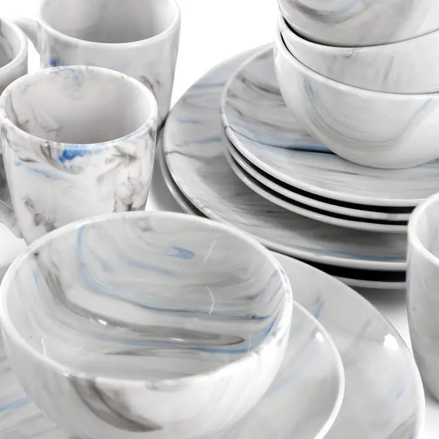 Bring the sophisticated look of marble into your home with the Elama Fine Marble 16 Piece Porcelain Dinnerware Set in Blue and Gray. Every plate in this collection is decorated in a fine marble pattern and coated in a glaze finish for a sleek and shiny look. This dish set is crafted from quality Porcelain, making it both microwave and dishwasher safe for easy cleaning and everyday use. Tableware set comes with a full service for four, making this the perfect addition to your dining room table for family gatherings or dinner parties.