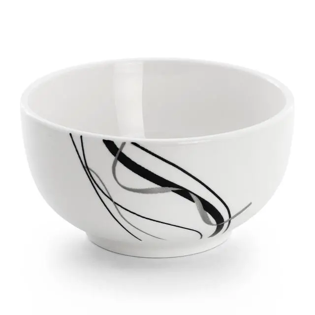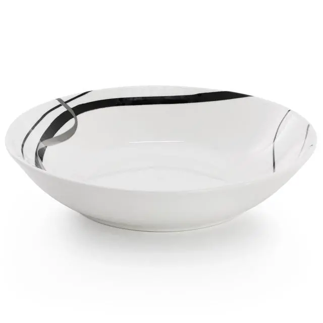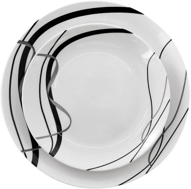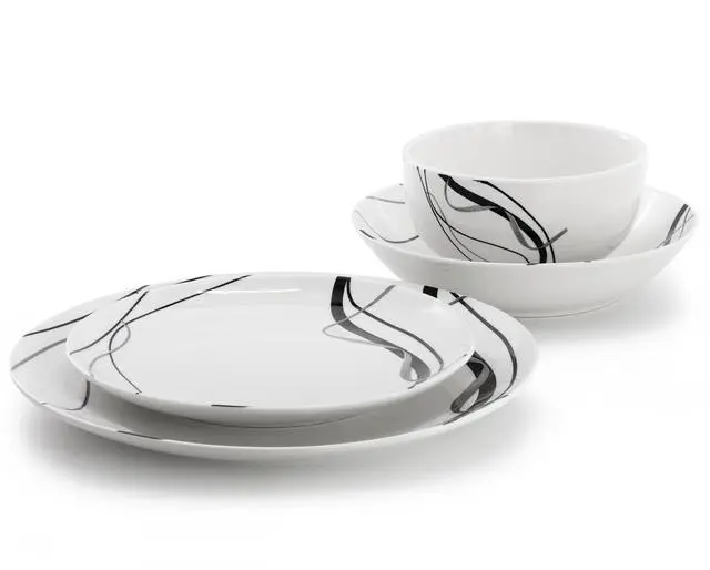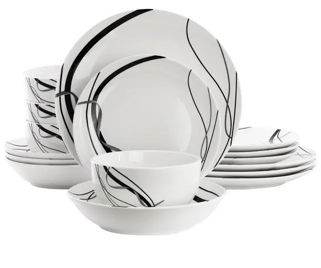 Enjoy your every day meals in style with the Elama Sarah 16 Piece Double Bowl Porcelain Dinnerware Set for four people. This set is designed with a mix of gray and black ribbon graphic lines adorning each dish, making each meal stand out a little extra. Sturdy porcelain construction with a glazed finish makes this set both durable and elegant. Whether you are serving your family or having guests over, this set is perfect to use for any occasion.