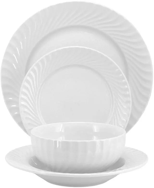 The Elama Julia 16-Piece Scalloped Round Porcelain Dinnerware Set in White brings timeless elegance to your dining table with its sleek design and refined details. Crafted from high-quality porcelain, each piece features a delicate wave pattern along the rim, adding a touch of sophistication to any meal. The crisp white finish enhances the presentation of your favorite dishes, making this set perfect for both casual dining and special occasions.
