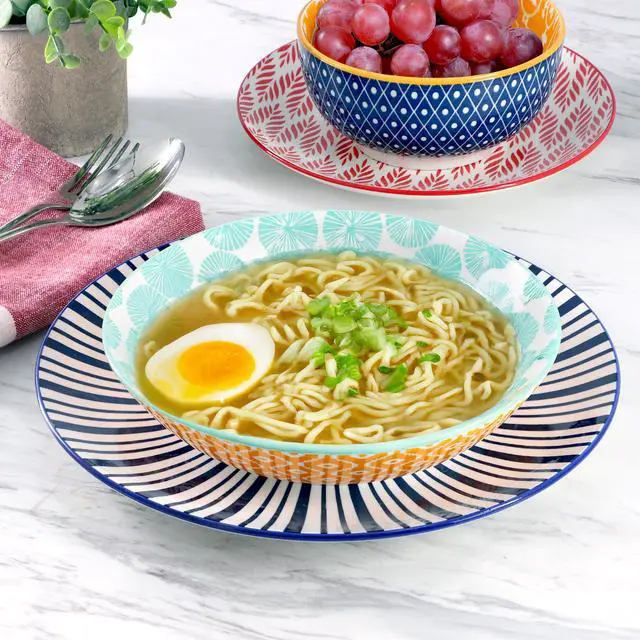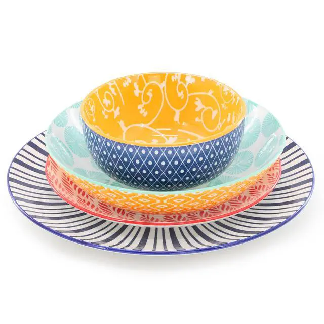 The Elama Giovanna 16 Piece Assorted Porcelain Double Bowl Dinnerware Set is a beautifully crafted collection that brings a pop of color and charm to your dining table. Made from durable porcelain , this set features a glossy finish and a vibrant multi-color design that complements any decor. The round shape of each piece ensures a timeless, classic look while offering generous space for serving your favorite meals. This set includes four dinner plates, four dessert plates, four soup bowls, and four cereal bowls, perfect for both casual dining and special occasions. The assorted designs add a unique, personalized touch to each piece, making it a delightful addition to your tableware collection.