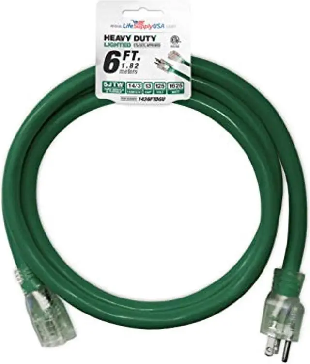 6 ft Extension cord 14/3 SJTW with Lighted end - Green - Indoor / Outdoor Heavy Duty Extra Durability 13AMP 125V 1625W ETL listed by LifeSupplyUSA This is a high quality part by LifeSupplyUSA, exclusively for sale by LifeSupplyUSA. Any brand names or logos are the registered trademarks of their respective owners. Any use of any brand name or model designation for this product is made solely for purposes of demonstrating compatibility