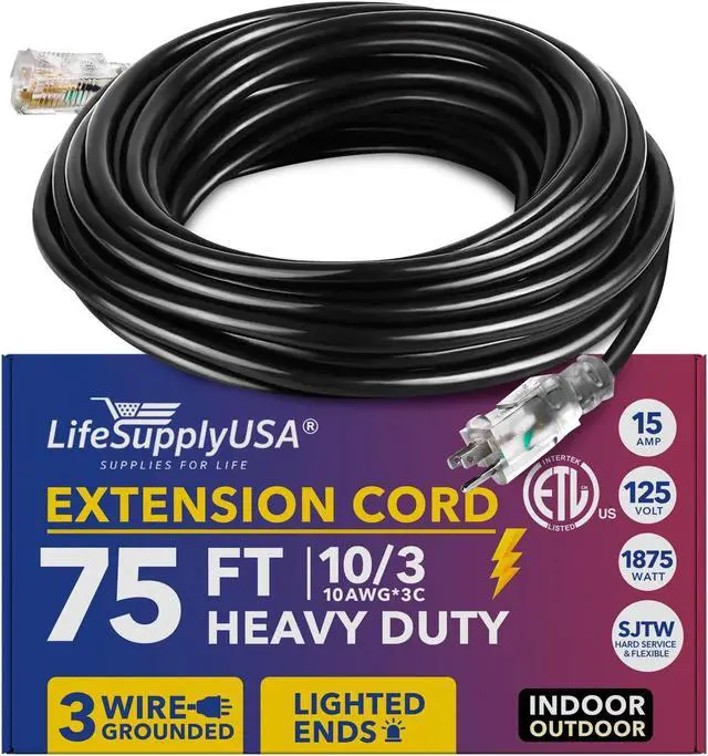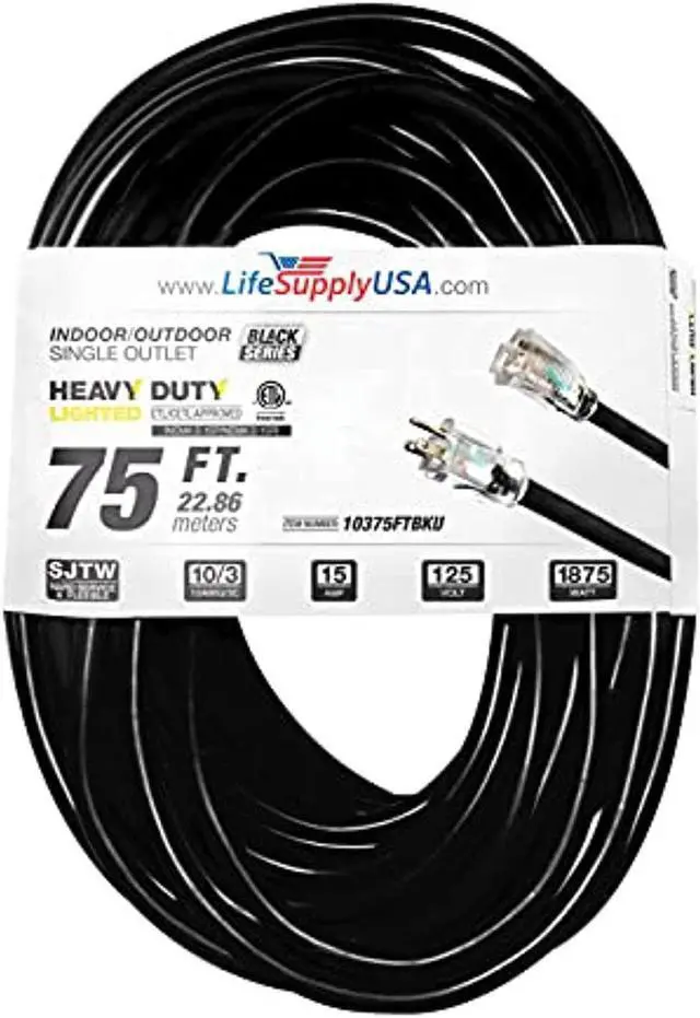 GREAT VALUE: 75 ft Extension cord 10/3 SJTW with Lighted end - Black - Indoor / Outdoor Heavy Duty Extra Durability 15AMP 125V 1875W ETL listed by LifeSupplyUSA |