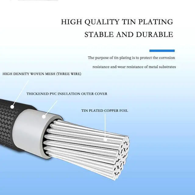 Triple-Layer Structure with Braided Nylon:Combines inner copper core, insulating PVC jacket, and an outer braided nylon mesh for exceptional flexibility, wear resistance, and an organized look.