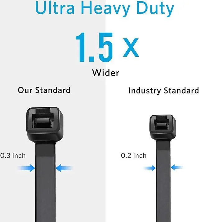 Our strong zip ties width is 0.3 inch, wider than standards(0.14 inch).