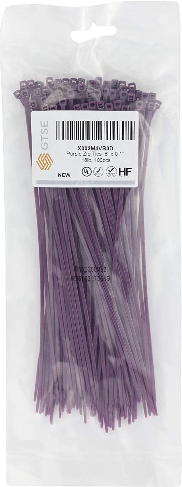 Item specificsSize: 8" x 0.1"Color: PurpleQuantity: Pack of 100Material: UL approved Nylon Polyamide 6/6, 94V-2Dielectric Strength: 50,000 volts/mmMin. Tensile Strength (kg): 18lbMax Diameter (mm): 8"Resistance: Resistant to external agentsFlammability Rating: UL 94 class V2Operating Temperature: -40°F to +185°F