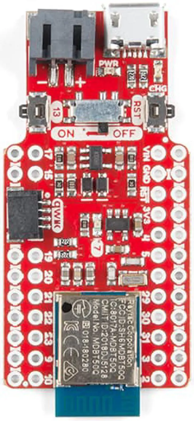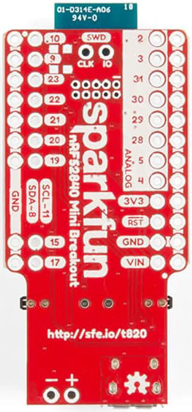 The SparkFun Pro nRF52840 Mini is a breakout and development board for Nordic Semiconductor’ s nRF52840 – a powerful combination of ARM Cortex-M4 CPU and 2.4GH z Bluetooth radio. This mini development board for the nRF52840 breaks out most of the critical I/O pins including GPIO and those needed for power while maintaining a small footprint that nearly matches that of the Arduino Pro Mini (except those covered by the Qwiic Connector). It features a USB interface (using the nRF52840’ s native USB support), which can be used to program, power, and communicate with the chip making it able to be used for any purpose (UART, I2C, SPI) that those of the Arduino Pro Mini could. The Pro nRF52840 Mini features a Raytac MDBT50Q-P1M module. This module connects the nRF52840 to a trace antenna, fits the IC into an FCC-approved footprint, and also includes a lot of the decoupling and timing mechanisms that would otherwise be required for a bare nRF52840 design. Also included onboard is a LiPo battery charger, a Qwiic connector, an on/off switch, a reset switch, and a user LED/button.