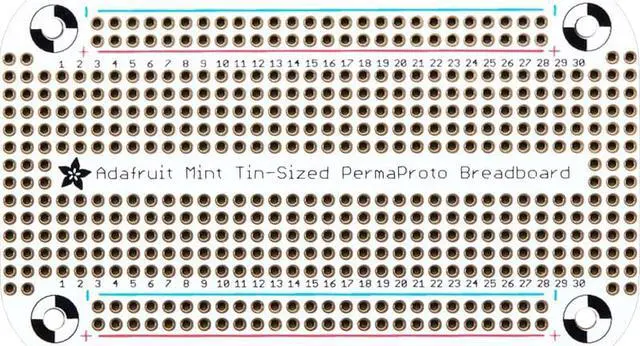 This proto-board is the PCB you always wish you had, but never realized it! We took the basic layout of a half-sized breadboard, extended it to the size of a mint tin and turned that into a beautiful PCB. The top side has a white silkscreen, and the same markings you're familiar with, to make transferring components easy. The bottom has 30 rows of 5-hole pad design that matches a classic breadboard, with 4 power bus lines on the sides, and no mask so you can easily cut traces when necessary. There are another 80 holes for general wiring on the edges. We used 1.2mm diameter drill holes so even parts with big leads will fit. All holes are thru-plated for strength - these wont peel off with rework. The finish is a gold plate - you won't get oxidation like with bare copper perf! There are also four big mounting holes so you can attach the PCB to the tin. A perfect match for a Altoids-sized mint tin