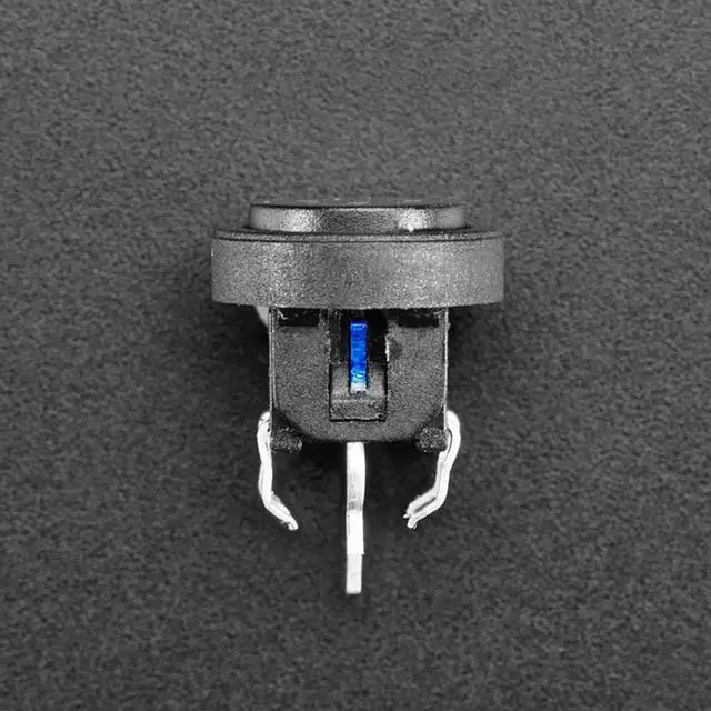 The tact switch is about the same size as 6mm tactile switches and can snap into a breadboard. There are an additional two pins that connect to the anode and cathode of a small LED that shines through the top.