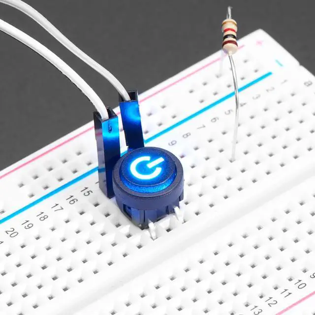 Note that this is a momentary button, not a on-off switch! Also, the LED is not connected to the switch in any way, and does not include a resistor. You'll need to add your own ~1K resistor and control the LED with a microcontroller pin or whatever you like.
