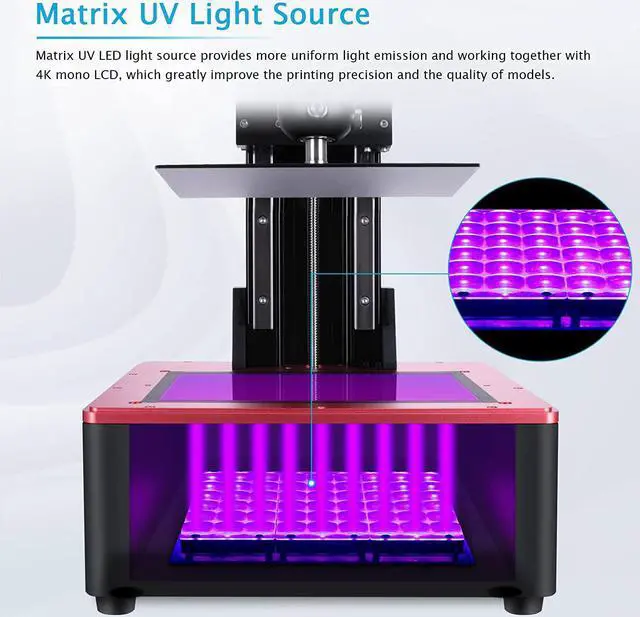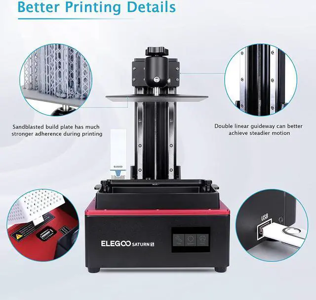 Higher precision and easier printingZ-axis utilizes a double linear guide-way structure, which can achieve steadier motion and greatly enhanced moving accuracy. With the Ethernet port on the back, Saturn now supports file transfer through your local area network, which is very handy for fast printing. Quality Prints and Consistent SuccessMatrix light source consists of 54 UV LED lights with uniform light emission, ensuring superior print results and a more accurate printing size. The set screws on the build plate assure long-lasting leveling, no need for frequent calibration, and the sandblasted surface provides a much stronger adherence, especially when printing large 3D models.