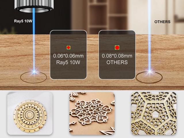 - Ray5 adopts the latest compressed technology, which generates an ultra-fine spot, two times thinner than ordinary, making Ray5's cutting & engraving work more precise and consistent, with thinner lines, clearer texture, and more delicate and beautiful artwork.