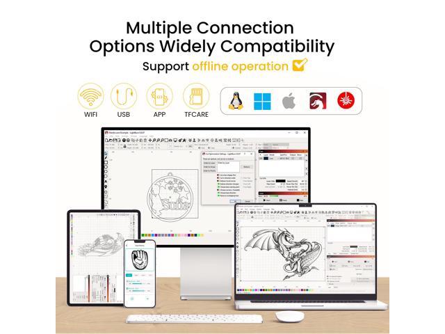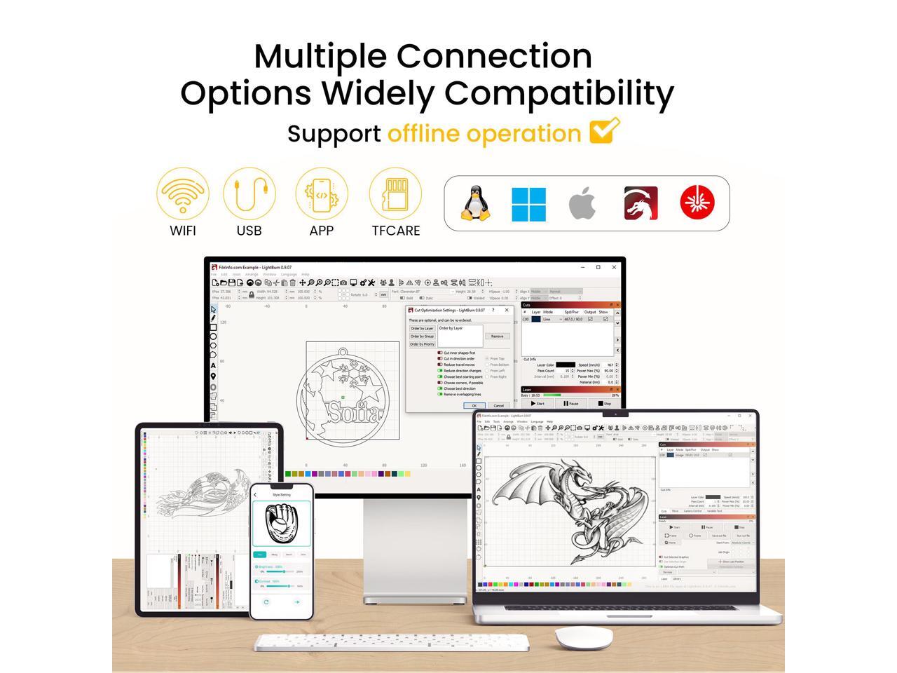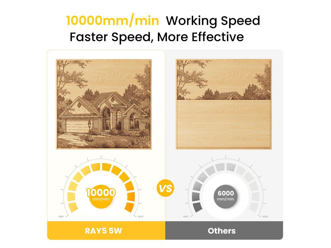- [32-bit chipset and WIFI connectivity] RAY5 is built using the 240MHz ESP32 chipset. It is faster and more powerful than the equivalent machine with 8-bit chipset. Support WIFI connection to control engraving or cutting through web or application, more convenient.