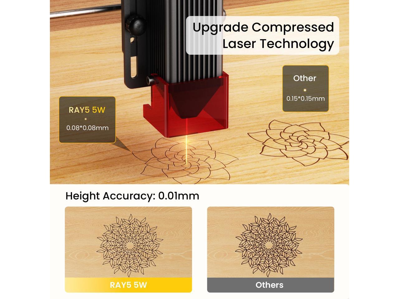 - [Touch screen and offline engraving] 3.5-inch smart color screen, so you can easily meet various DIY needs. Built-in controller, no need to connect the laser engraving machine with computer. Just save the file to TF card, Ray5 will engrave or cut according to the program you set, use Ray5 anytime and anywhere.