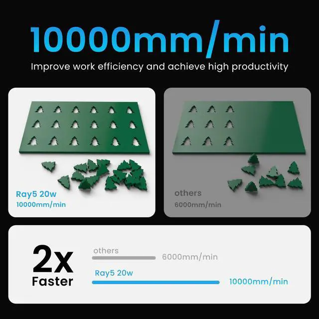 Longer RAY5 20W Laser Engraver With a 0.08 x 0.1 mm compressed beam laser head and precise rails, the RAY5 offers high precision and fast engraving with speeds up to 10000mm/min. It enables efficient engraving and cutting, saving time and costs while delivering intricate, high-precision designs, text, and fine details.