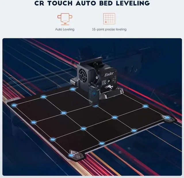 • CR Touch Auto Bed Leveling: Upgraded CR Touch 16-point automatic bed leveling technology saves you the trouble of manual leveling. Easy to use, the intelligent leveling system can automatically compensate for the printing height of different points of the heatbed.