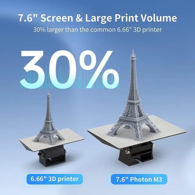 Larger Print VolumeThe Photon M3 is equipped with a 7.6 -inch LCD screen with a print volume of 163x 102 x 180 mm, 30% larger than the common 6.66" 3D printer.