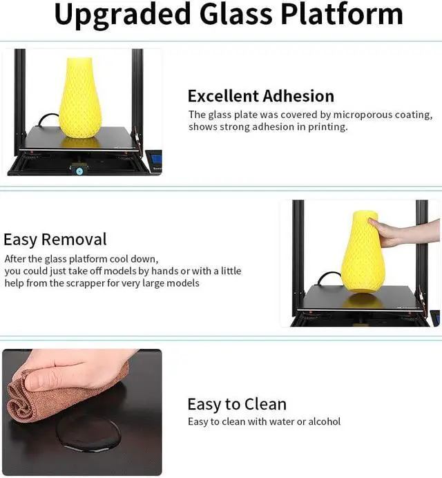 CARBON CRYSTAL SILICON GLASS BED - This printer comes with a reliable and flat glass bed. Forget about other printers with uneven printing surfaces and warped beds. This glass bed ensures a 100% usable and flat surface for any print from the smallest test file to the largest model. Adjustable belt tensioners make SV03 achieve proper belt tension to get high quality prints.