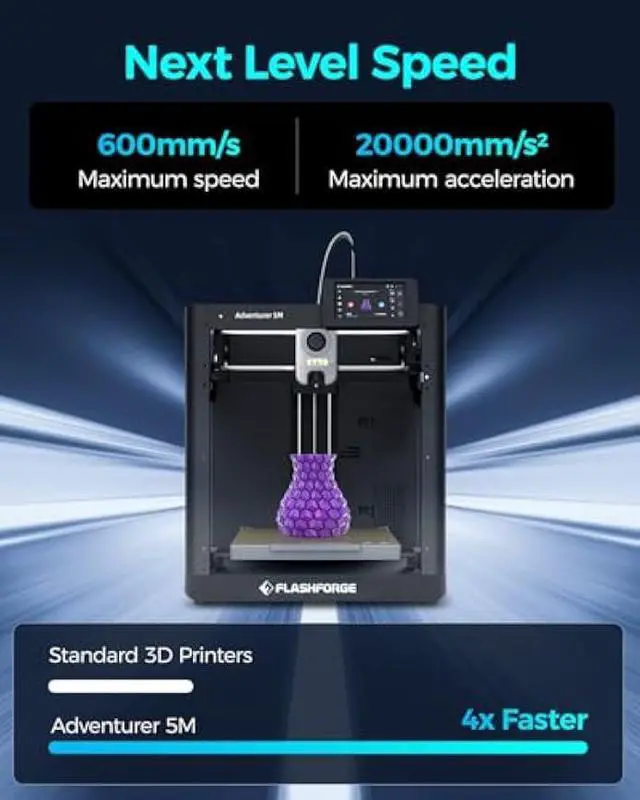 600mm/s Hyper-Speed & Rapid Heating. Unbox to first print in 10 minutes! Achieve lightning-fast 3D printing with industry-leading specs: 600mm/s max speed, 20, 000mm/s² acceleration, 32mm³/s flow rate, and a 50W hotend that hits 200°C in 35 seconds. Slash print times without sacrificing quality.