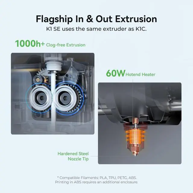 300°C and 1000H+ CLOG-FREE DIRECT EXTRUDER: K1 SE upgraded 3d printer has the multiple nozzle sizes ( 0.4, 0.6, 0.8 mm) and a 300°C Dual-gear direct drive extruder, Apart from commonly seen filaments, it can also handle the flexible TPU, PLA, PETG and ABS. The ceramic heater, encircling the hotend, can fully melt ABS*, and other filaments for ultra-fast printing