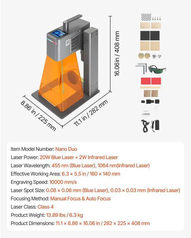 Laser Wavelength: 455 nm (Blue Laser), 1064 nm (Infrared Laser)