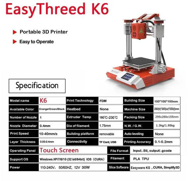EasyThreed K6 3D Printer for Kids and Beginners, Desktop FDM 3D Printer with 2.4'' Touchscreen Control, 10m PLA Filament, Quick Assembly, Print Size 3.94x3.94x3.94in