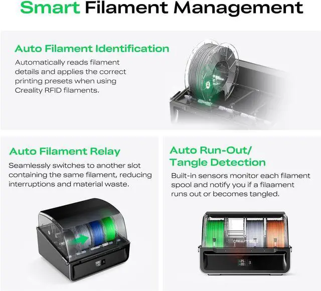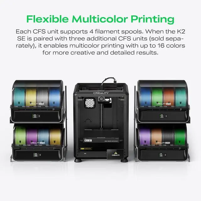 Milticolor 3D Printing with CFSThe K2 SE Combo 3D printer can achieves smooth multicolor 3D printing, enabling seamless color transitions for creative models and professional prototypes. The smart Creality CFS offers auto-switching, color recognition, and moisture-proof filament storage, ensuring stable feeding and clean multicolor results on your 3D printer.