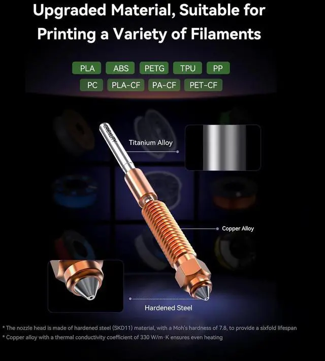 Higher temperature resistance:Creality Ender 3 V3 KE Hotend bimetallic material nozzle is designed for higher temperature resistance and faster speed, allowing you to reach up to 300 °C effortlessly