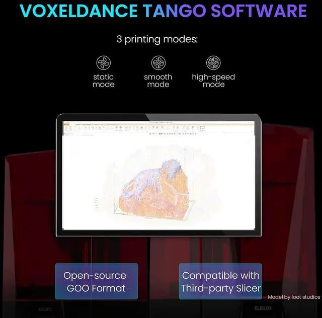 Voxeldance Tango SoftwareELEGOO Saturn 3 Resin Printer offers 3 printing modes: static mode and dynamic mode (including smooth mode and high-speed mode) to improve printing efficiency. The open-source GOO slice file format is compatible with third-party slice software, such as CHITUBOX and Lychee Slicer.