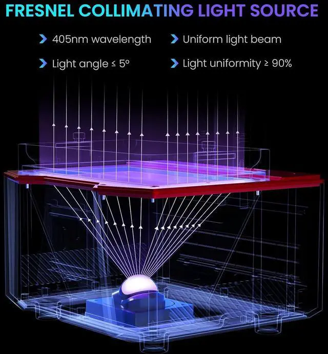 Fresnel Collimating Light SourceThe COB light source and Fresnel collimating lens work together to emit a uniform light beam of 405nm wavelength, and ensure that the light angle reaches within 5°, light uniformity is over 90%, and light-scattering coefficient within 0.5%. This results in highly accurate and consistent prints with exceptional clarity and detail.