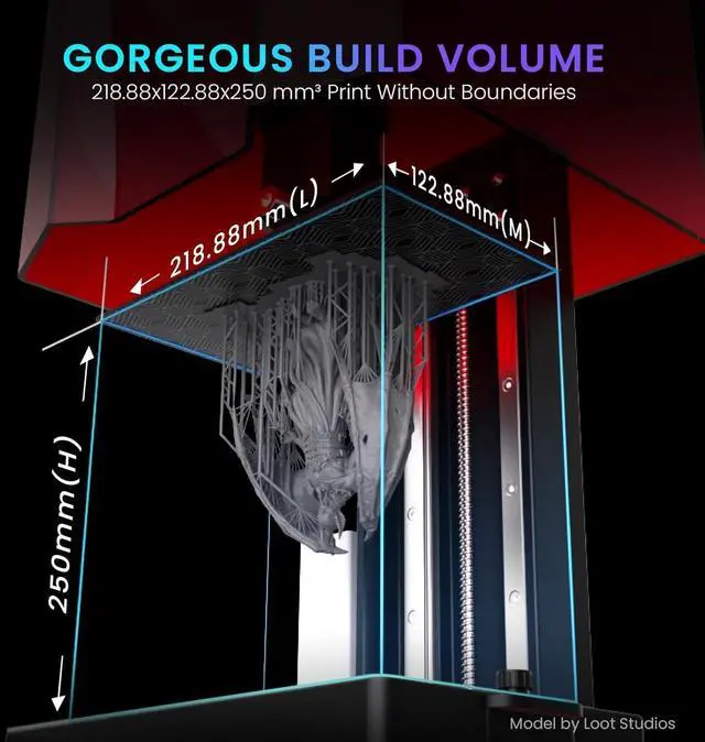 Generous Build VolumeWith a generous build volume of 218.88x122.88x250 mm³/8.62x4.84x9.84 inches, you can try to print larger models and more ambitious projects for greater flexibility and versatility.
