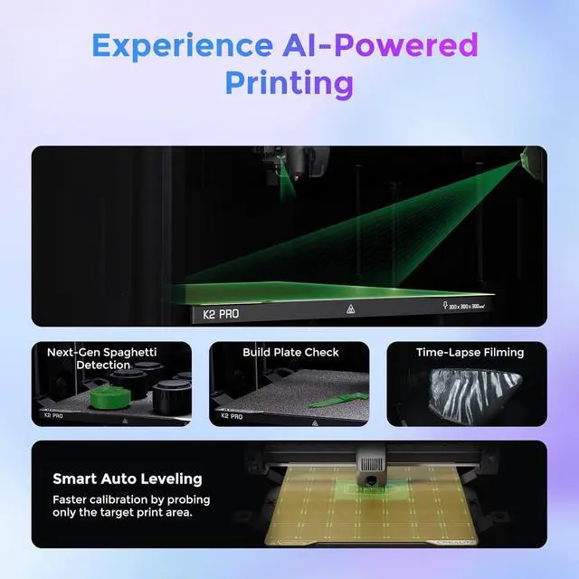 AI-Powered Smart Monitoring SystemBuilt-in AI cameras detect filament errors, foreign objects, or idle alerts in real-time. Enable remote monitoring via time-lapse capture and automatic failure notificationskeeping prints secure even during overnight runs.