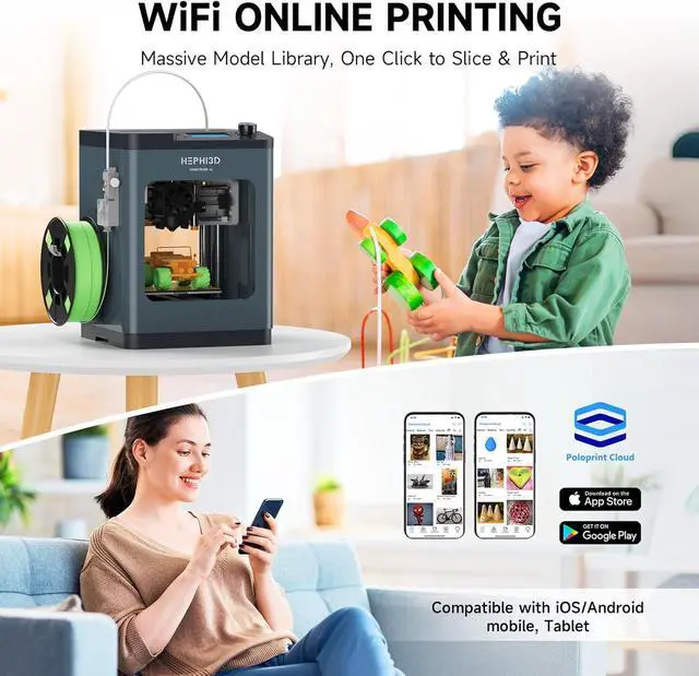 Smart APP Wireless Printing Fully assembled 3d printer, out of the box. Compact TINA2S 3D printers with self-developed APP "Poloprint Cloud", which has massive models library, realize the smartphone or tablet intellegent online one-click slicing and wifi cloud printing, no tedious operation, an ideal gift for men, women, beginners, teens, kids, etc.