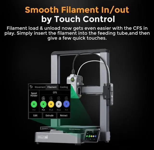 Multi Color Printing: Creality Hi 3d printer, which can fulfill the multi color printing with a CFS filament management system, up to 16 colors with 4 CFS can be printed together. Single color printing is tedious, this printer brings you a new experience in printing job, increasing much fun in your life. An intelligent management of multiple filaments, no worry to paint your prints. Note: The CFS is not included in this product. The Creality Hi can't fulfill the multi color printing alone, it needs to add a CFS to fulfill it