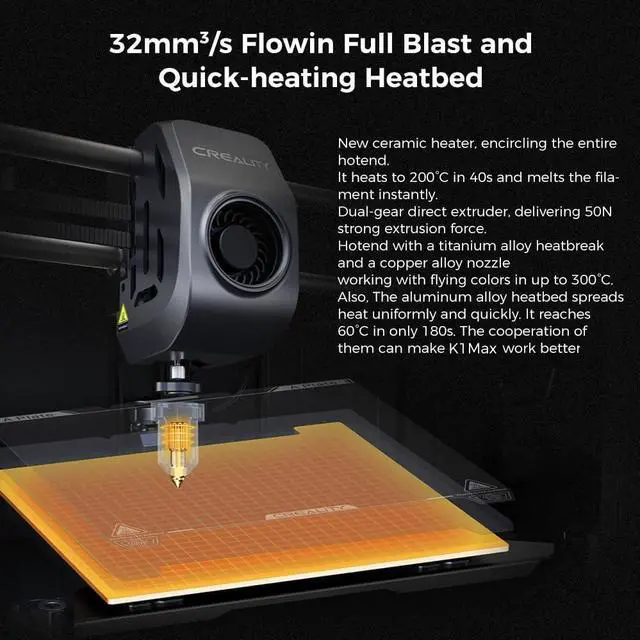 Efficient Printing: With flow max 32 millimeters per square second, K1 3d printer has a new ceramic heater, encircling the entire hotend, it can heat to 200 degree in 40 seconds quickly and melts the filament instantly. Its max heating temperature is 300 degree