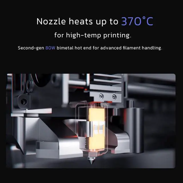 Higher printing temperature & Wide Material Compatibility: The X-PLUS4 comes with an upgraded 80W high-temperature hotend and multi-metal integrated throat nozzle, reaching a maximum temperature of 370°C. Designed for faster installation and removal, it reduces clogging risks and offers exceptional wear resistance. This setup supports a wide range of high-temp filaments, including PPS-CF, PPA-CF/GF, ABS, ASA, PC, PA, PET and more, making it perfect for diverse printing applications.