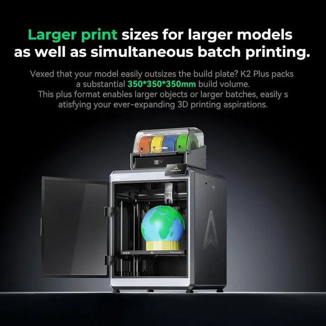 Larger Size to Meet More Needs: Compared to Creality K2 and K2 Pro, the Creality K2 Plus offers an extraordinary 350*350*350mm large build volume, great for handling larger objects or larger batches, large models dont require partitions, and small models are printed in batches more calmly, easily satisfying your ever-expanding 3D printing aspiration