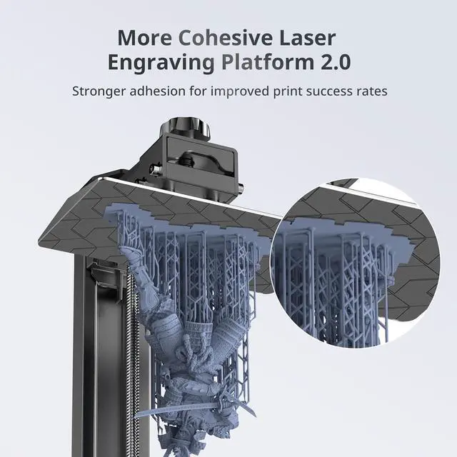 Laser-engraved Print Platform 2.0With a new design, the laser engraving platform of the photon mono 4 improves adhesion to mitigate lifting and warping of the model during 3d printing, while keeping the removal process simple and smooth.