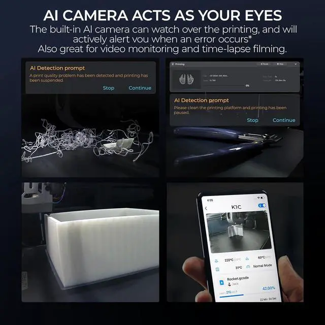 AI Camera for Smart Monitoring The K1C includes an AI camera for real-time monitoring, detecting issues like filament tangles and failures. It also supports time-lapse filming, allowing users to track print progress remotely and efficiently.