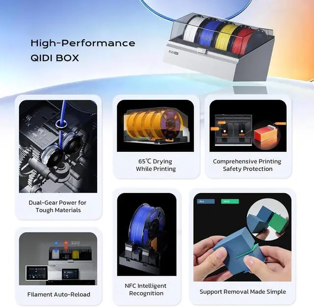 [Unlock Multi-Color & Multi-Material] Q2 with QIDI BOX enables up to 16-color multi-material 3D printing with dry-while-print technology, keeping filaments dry for stable extrusion and smooth surfaces. Supports PLA, ABS, PETG, TPU, PA, PC and carbon/glass-fiber composites for strong, precise prototypes and vibrant models.