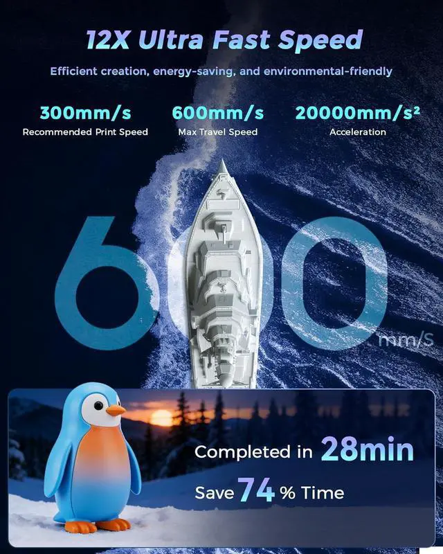 Ultra Speed and Efficiency:AD5X 3D Printer can reach up to 600mm/s travel speed and 20m/s² acceleration. with 300°C High Temp nozzle and 32mm³/s large flow hotend will greatly shorten the waiting time for printing.Easily achieve multi-color printing for flexible TPU,carbon fiber filament,PLA and PETG,etc